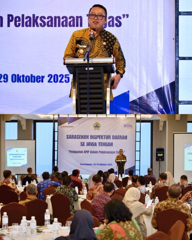 KARANGANYAR — Aparat Pengawas Intern Pemerintah (APIP) memiliki peran penting dalam menjaga integritas dan akuntabilitas tata kelola pemerintahan. Guna memperkuat kapasitas dan sinergi pengawasan di daerah, para Inspektur Daerah se-Jawa Tengah mengikuti Sarasehan Inspektur Daerah Tahun 2025 yang digelar di Hotel Nava Tawangmangu, Kabupaten Karanganyar, Selasa (28/10).