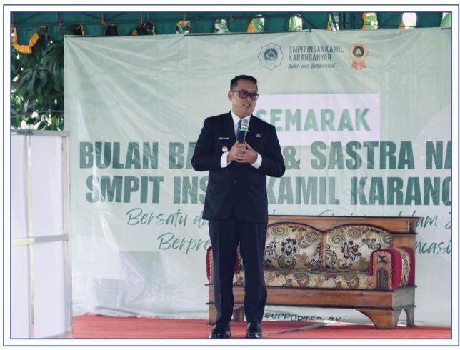“Hari ini saya merasa bangga dan berbahagia dapat memberikan sambutan dalam rangka Bulan Bahasa dan Sastra Nasional SMPIT Insan Kamil Karanganyar Tahun 2025. Tantangan kita ke depan adalah bagaimana kita bisa bersatu dan terus menumbuhkan semangat cinta bahasa dan bangsa,” ucapnya.