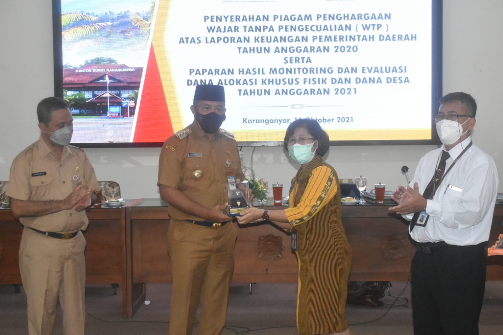 “Saya berharap petunjuk teknis juga dilakukan di awal tahun sehingga penyerapaan anggaran DAK bisa tepat waktu,” ujar Juliyatmono saat memberikan sambutan dalam acara Penyerahaan piagam Penghargaan Wajar Tanpa Pengecualian (WTP) atas Laporan Keuangan Pemerintah Daerah Tahun Anggaran 2020 serta Monitoring dan Evaluasi Dana Alokasi Khusus Fisik dan Dana Desa Tahun Anggaran 2021 di Rumah DInas BUpati Karanganyar, Senin (11/10).