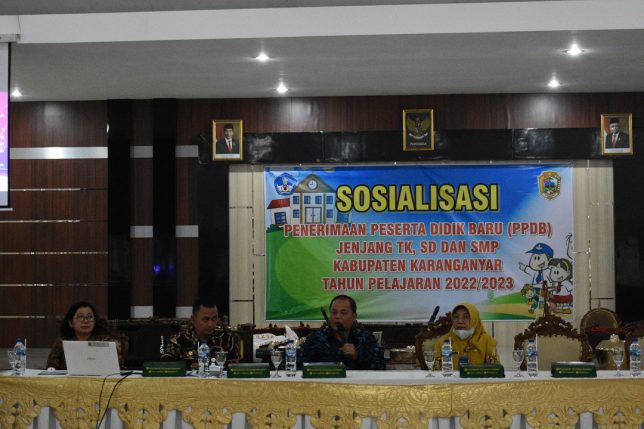 Sosialisasi Penerimaan Peserta Didik Baru (PPDB) ini dilaksanakan di Aula Ki Hajar Dewantara Dinas Pendidikan dan Kebudayaan Karanganyar. Dimana sosialisasi ini menargetkan Kepala Sekolah SMP Negeri, Swasta (Sekolah Menengah Pertama) dan Korwil Pendidikan (pengawas) se Kabupaten Karanganyar sebagai Peserta sosalisasi guna menghadapi Penerimaan Peserta Didik Baru (PPDB) Tahun Pelajaran 2022/2023 yang akan dilaksanakan pada tahun ini.