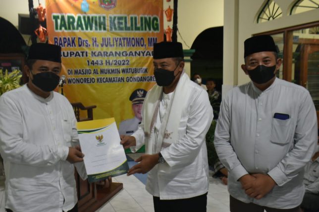 KARANGANYAR – Hari kedua sholat Taraweh Keliling (Tarling) Pemkab Karanganyar bertempat di Masjid Al Mukmin Watuburik, Desa Wonorejo, Kecamatan Gondangrejo, Senin (04/04). Selain Bupati Karanganyar, Drs Juliyatmono MM hadir Wakil Bupati Karanganyar, H Rober Christanto SE MM dan Kapolres Karanganyar AKBP Danang Kuswoyo SIK serta sejumlah kepala OPD Pemkab Karanganyar. Tarling kedua tersebut juga dihadiri 13 Kepala Desa, Forkompinca dan masyarakat sekitar Masjid Al Mukmin Watuburik.