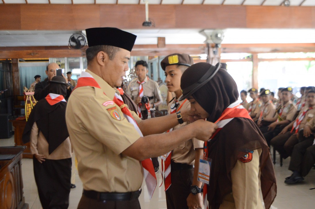 Penyematan tanda peserta Aksi Bolden Powell secara simbolis oleh Bupati Karanganyar, Juliyatmono.