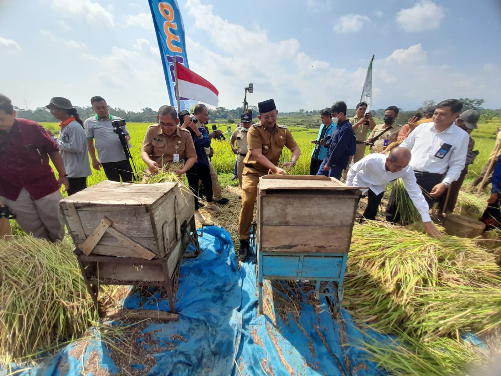 Wakil Bupati Karanganyar, Rober Christanto menggunakan perontok padi zaman dahulu