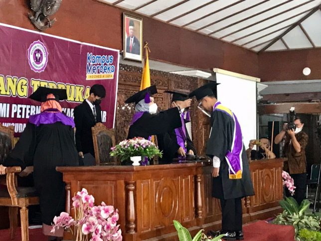 KARANGANYAR- Sidang terbuka Senat Akademi Peternakan Karanganyar dalam rangka wisuda ke XLIV Program Diploma III digelar di Pendopo Rumah Dinas Bupati Karanganyar, Selasa (19/10/2021). Dalam wisuda tersebut Apeka meluluskan 37 orang dengan rincian 28 mahasiswa dan 9 mahasiswi.